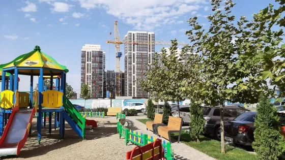 Придомовая территория ландшафтный дизайн,2-х уровневый стилобат,с детскими площадками и зонами отдых,удобный выезд и города.