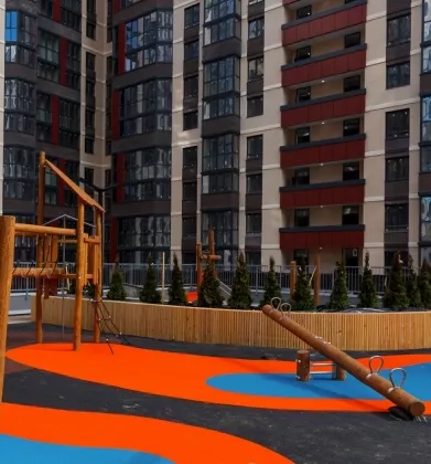 Придомовая территория ландшафтный дизайн,2-х уровневый стилобат,с детскими площадками и зонами отдых,удобный выезд и города.