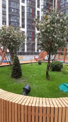 Придомовая территория ландшафтный дизайн,2-х уровневый стилобат,с детскими площадками и зонами отдых,удобный выезд и города.