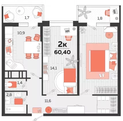 Квартира, площадью 62 м2, большая гостиная 20м2,,просторная кухня 12м2