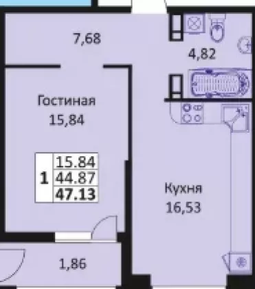 Квартира площадью 47 м3, гостинная 16 м2,кухня 14м2.