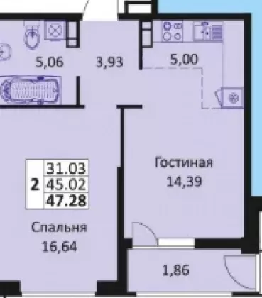 Квартира площадью 47 м3, гостинная 16 м2,кухня 14м2.