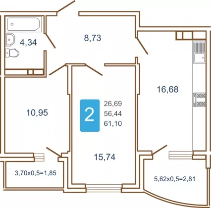 Продается 2-х комн. новостройка, 61.1 кв.м., 16/16 эт