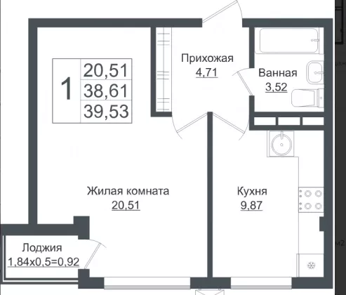 Квартира с прекрасной планировкой ,площадью 40 м2,с большой гостинной 19м2.
