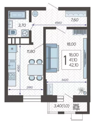 Продается однокомнатная новостройка, 42.52 кв.м., 11/12 эт