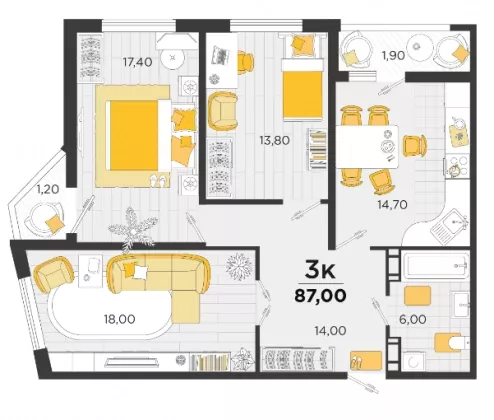 Квартира удачной планировки,просторные гостинные комнаты по 18м2,кухня 15м2
