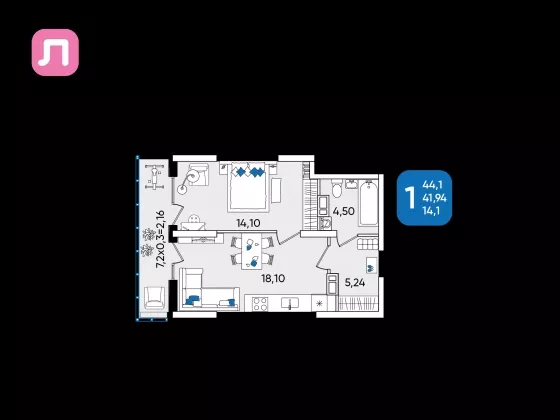 Продается однокомнатная новостройка, 44.1 кв.м., 15/24 эт