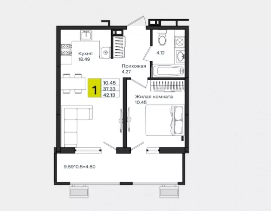 Продается однокомнатная новостройка, 42.13 кв.м., 6/8 эт