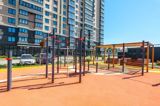 Современный благоустроенный двор. Витражное остекление, крепления под сплит-системы. Закрытый двор с лаунж-зонами и амфитеатром. Свои детский сад и школа прямо во дворе. Подземный паркинг.