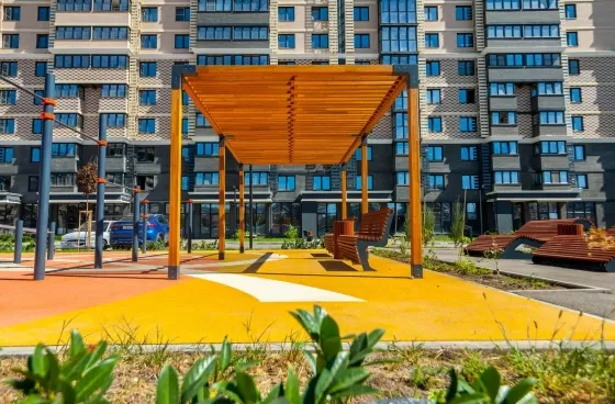 Современный благоустроенный двор. Витражное остекление, крепления под сплит-системы. Закрытый двор с лаунж-зонами и амфитеатром. Свои детский сад и школа прямо во дворе. Подземный паркинг.