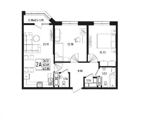 Продается 3-х комн. новостройка, 63.88 кв.м., 1/9 эт