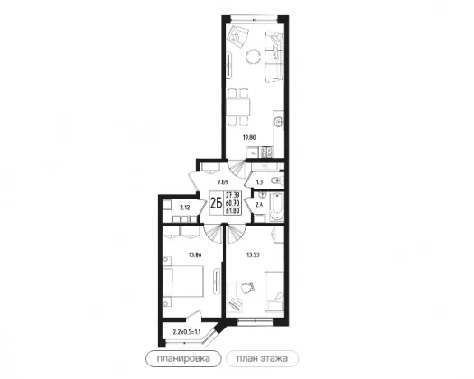 Продается 2-х комн. новостройка, 74.8 кв.м., 2/9 эт