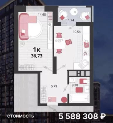 Продается однокомнатная новостройка, 36.7 кв.м., 4/18 эт