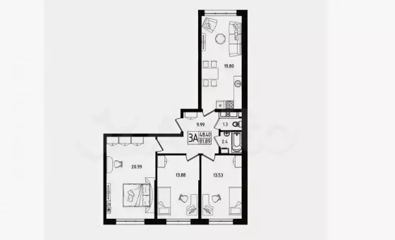 Продается 3-х комн. новостройка, 81.89 кв.м., 7/9 эт