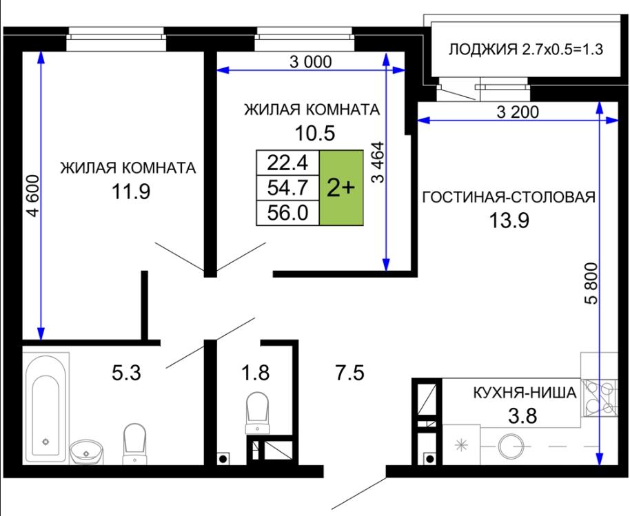 Продается 2-х комн. новостройка, 56 кв.м., 14/16 эт
