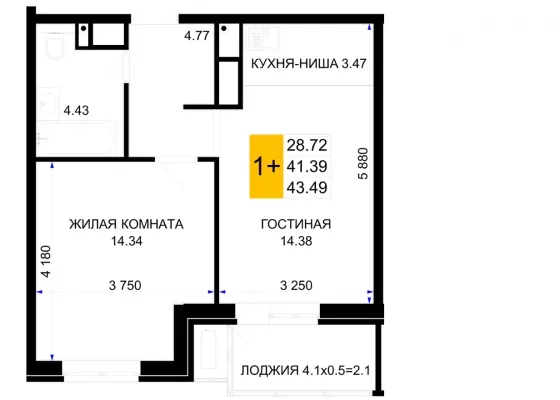 Продается однокомнатная новостройка, 43.49 кв.м., 9/12 эт