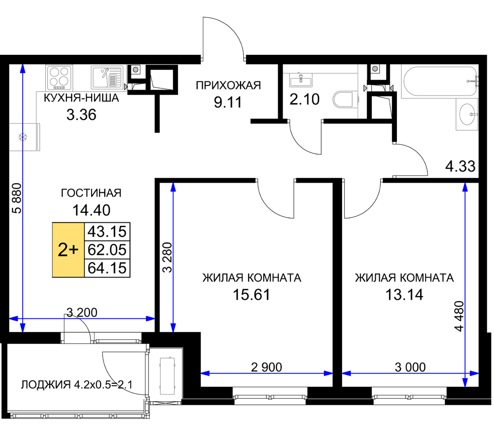 Продается 2-х комн. новостройка, 64.7 кв.м., 6/16 эт