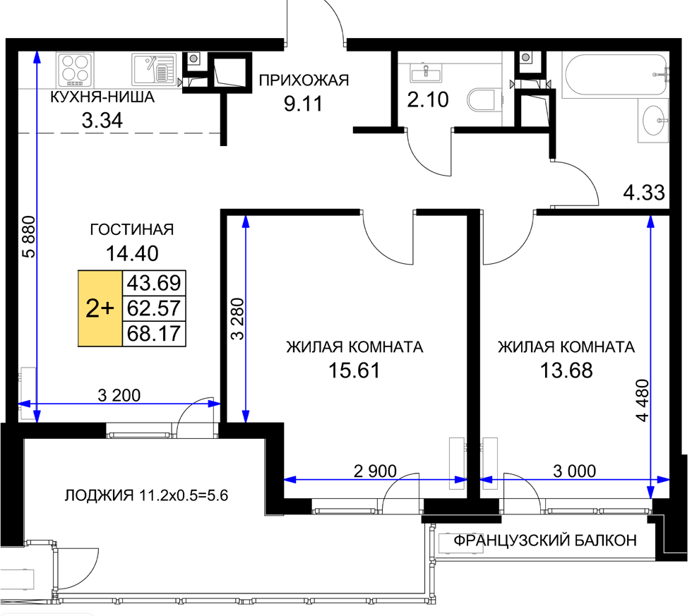 Продается 2-х комн. новостройка, 68 кв.м., 14/16 эт
