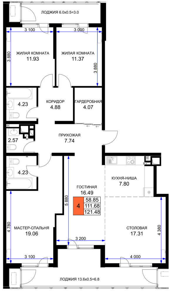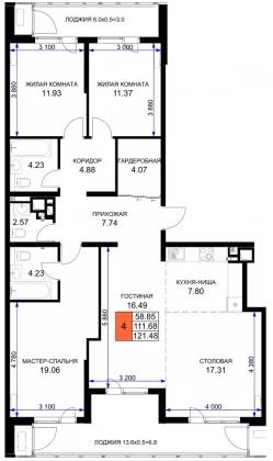 Продаётся 4-х комнатная квартира с большой кухней- гостиной, 2 лоджии 13,6 м2 и 6 м2 с витражным остеклением в пол, гардеробная, мастер- спальня!