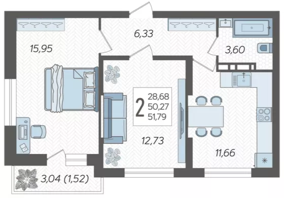 Продается 2-х комн. новостройка, 51.79 кв.м., 11/16 эт