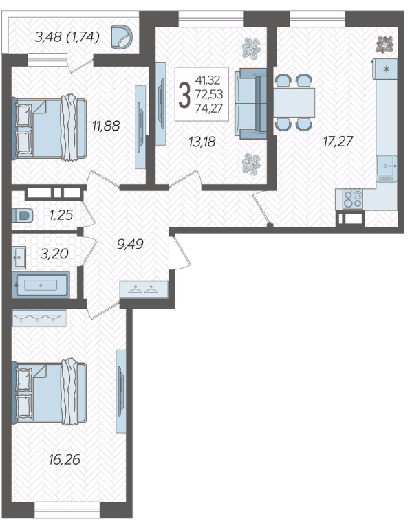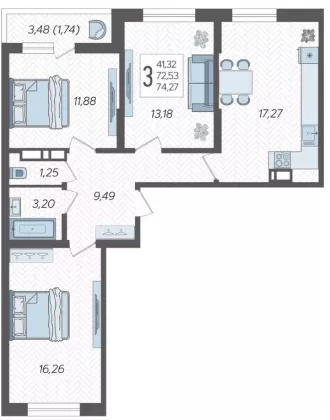 Продается 3-х комн. новостройка, 74.27 кв.м., 8/19 эт