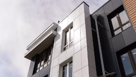 Очень красивый трехэтажный комплекс выполнен в современном, брутальном стиле.