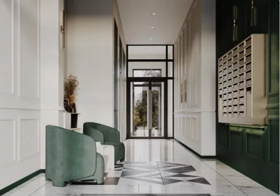 Домашний уют начинается со входа в лобби. Здесь создан авторский дизайн в классическом современном стиле, который является логичным продолжением строгой архитектуры квартала.
