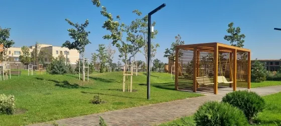 Сквер для прогулок с детскими площадками и зонами для спорта. Школа и детский сад уже принимают детей.