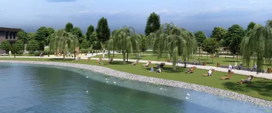 Сквер для прогулок с детскими площадками и зонами для спорта. Школа и детский сад уже принимают детей.