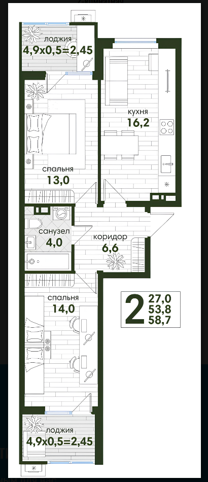 Продается 2-х комн. новостройка, 58 кв.м., 2/4 эт