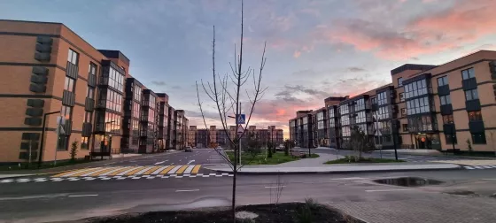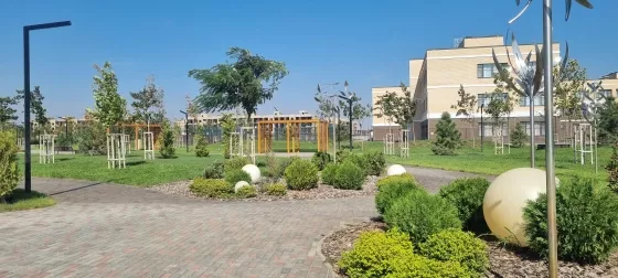 Сквер для прогулок с детскими площадками и зонами для спорта. Школа и детский сад уже принимают детей.
