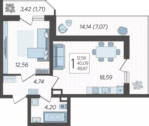 Продается однокомнатная новостройка, 48.98 кв.м., 18/23 эт