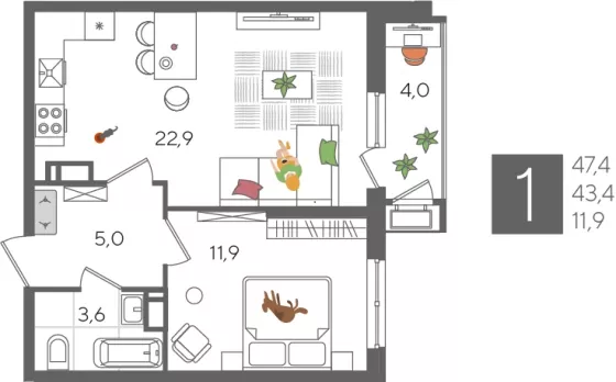 Продается однокомнатная новостройка, 48 кв.м., 19/24 эт