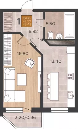 Продается однокомнатная новостройка, 42.3 кв.м., 2/17 эт