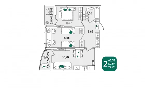 Планировка с просторной кухней-гостиной и двумя лоджиями!