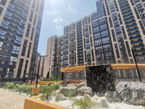 - Шикарный стилобат с фонтаном, мангальными зонами, детскими и спортивными площадками