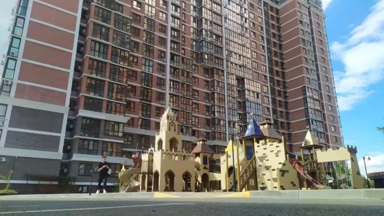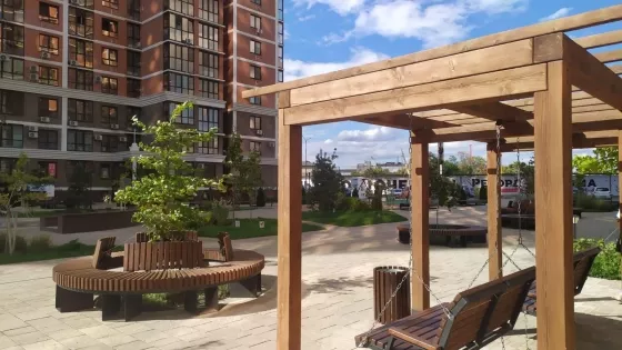 На территории комплекса есть все для максимально комфортного проживания: фитнес с бассейном, подземный и многоуровневый наземный паркинг с зарядками для электромобилей, детские и спортивные площадки для разных возрастов, фонтаны, ресторанный дворик с аллеей...