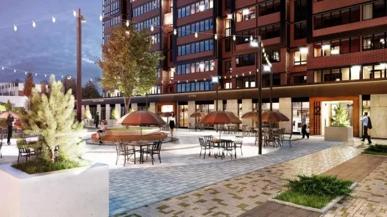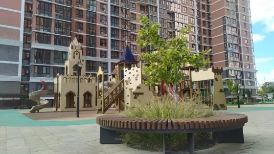 На территории комплекса есть все для максимально комфортного проживания: фитнес с бассейном, подземный и многоуровневый наземный паркинг с зарядками для электромобилей, детские и спортивные площадки для разных возрастов, фонтаны, ресторанный дворик с аллеей...