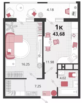 Продается однокомнатная новостройка, 43.68 кв.м., 8/17 эт