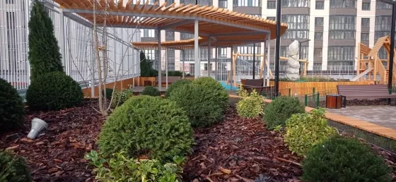 Шикарный стилобат с мангальными зонами, фонтаном, детскими и спортивными площадками, зеленым бульваром для прогулок и отдыха!