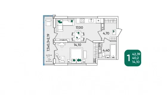 Замечательная планировка с кухней-гостиной и большой лоджией.
