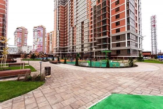 На территории комплекса есть все для максимально комфортного проживания: фитнес с бассейном, подземный и многоуровневый наземный паркинг с зарядками для электромобилей, детские и спортивные площадки для разных возрастов, фонтаны, ресторанный дворик с аллеей...