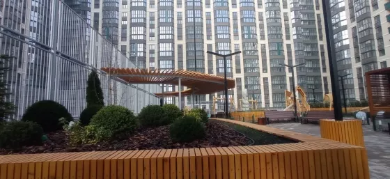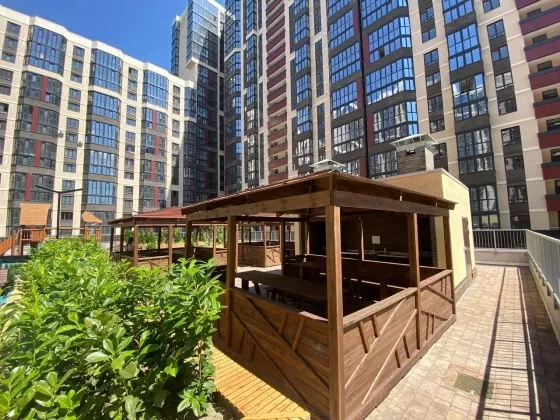 Шикарный стилобат с фонтаном, мангальными зонами, детскими и спортивными площадками, прогулочный бульвар с зонами для прогулок и отдыха.