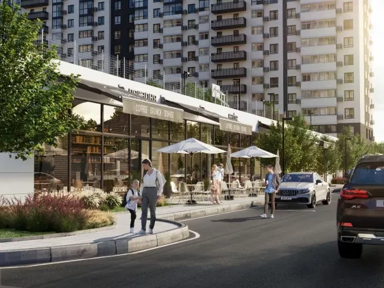 С внешней стороны комплекса коммерция с ресторанами, магазинами, салонами красоты и многим другим!