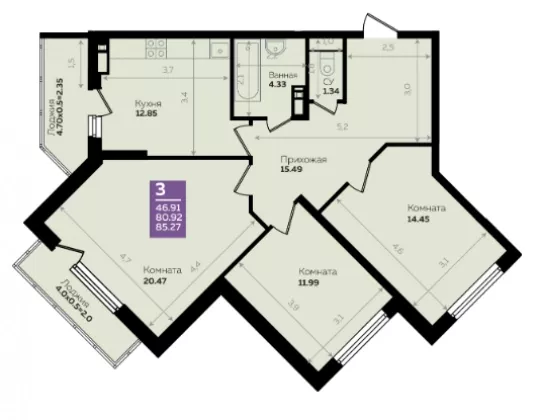 Трехкомнатная квартира в комплексе класса комфорт+ рядом с парком "Краснодар".
