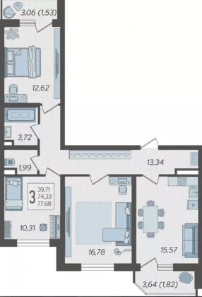 Продается 3-х комн. новостройка, 77.68 кв.м., 12/23 эт