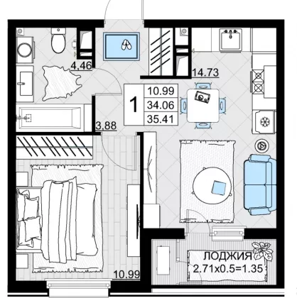 Продается однокомнатная новостройка, 36 кв.м., 11/18 эт