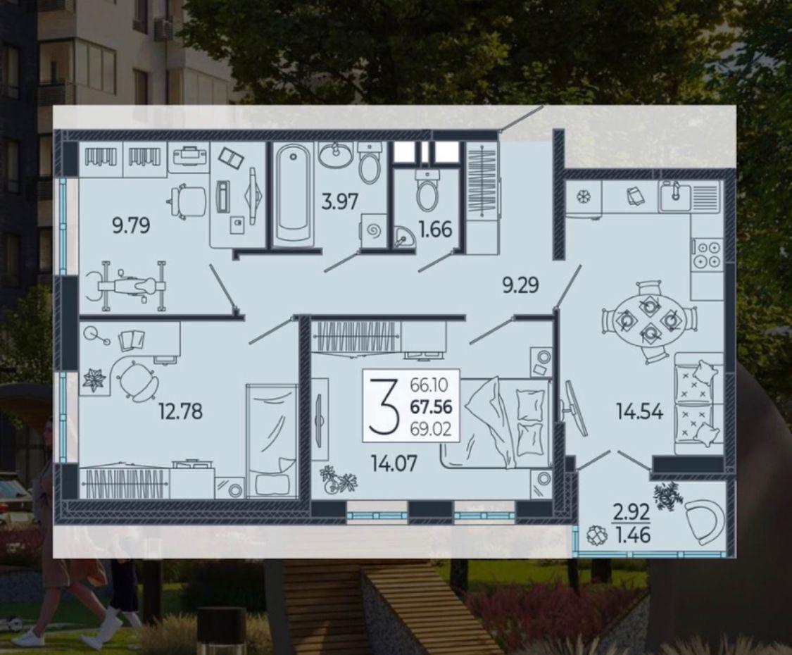 Продается 3-х комн. новостройка, 69.8 кв.м., 14/22 эт