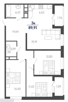 Продается 3-х комн. новостройка, 89.91 кв.м., 7/9 эт