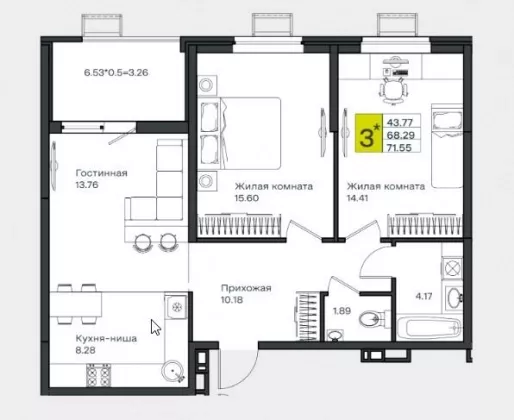 Продается 3-х комн. новостройка, 71.55 кв.м., 3/8 эт